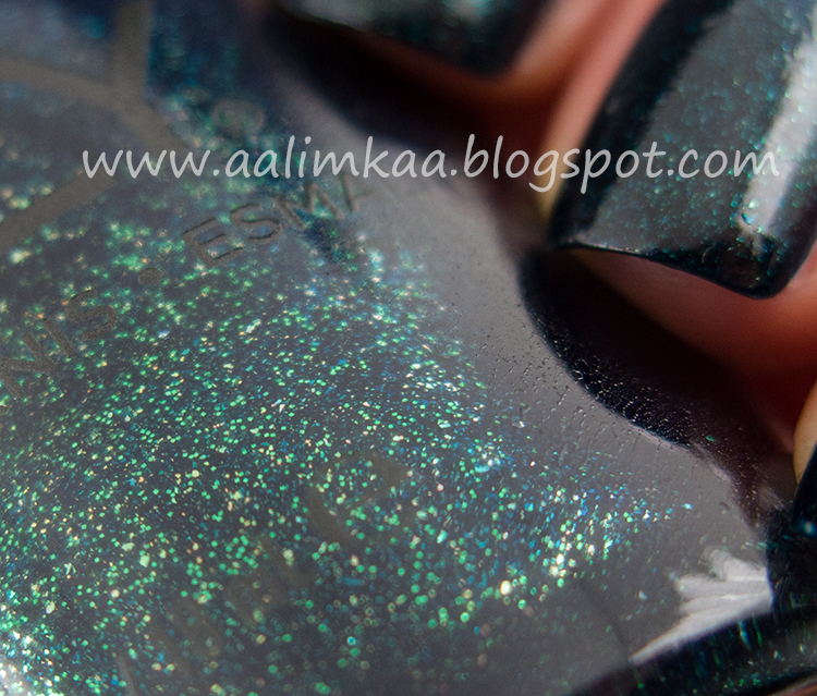 Kolor: ciemno granatowa baza, a w niej pływający drobny brokat w kolorze niebieskim, zielonym i złotym. Piękne połączenie.